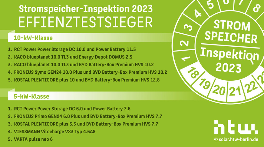 In einem weiteren Schwerpunkt der Stromspeicher-Inspektion 2023 bewertete die HTW Berlin die Energieeffizienz von Solarstromspeichern. Der Test wird bereits seit 2018 und zum sechsten Mal veröffentlicht. Die Wissenschaftler prüften 18 Speichersysteme von elf Unternehmen, darunter unter anderem BYD, Fronius, Kostal sowie Varta und Viessmann.