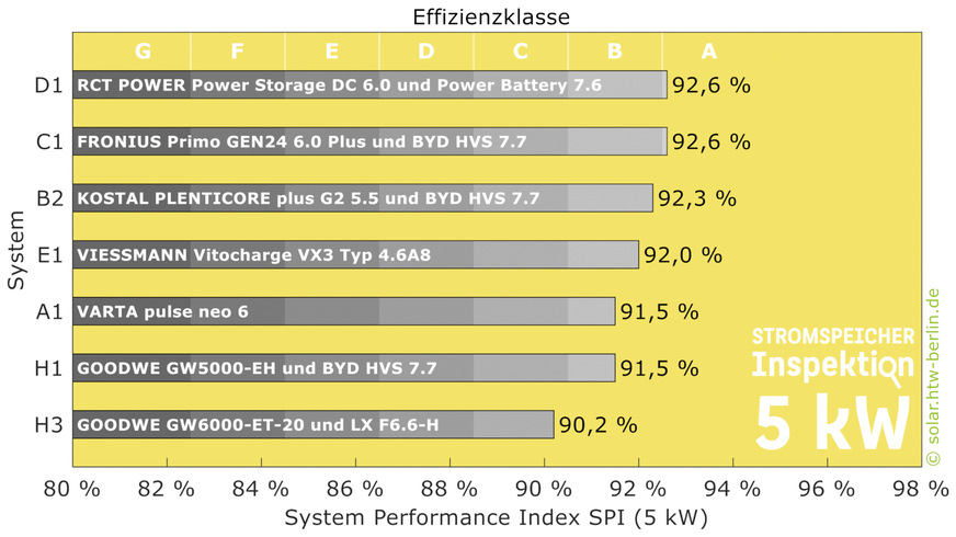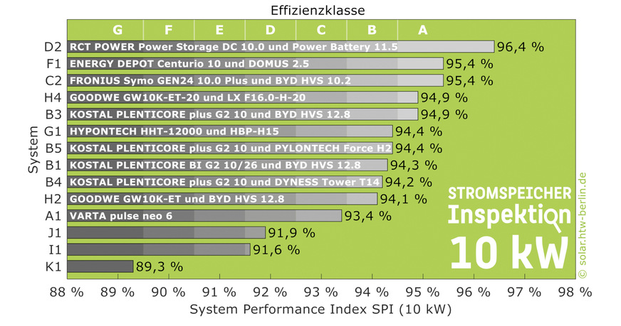 Die gute Nachricht: 16 der 20 ­untersuchten Systeme erzielten im aktuellen Test eine sehr gute Energieeffizienz. Lediglich drei Geräte konnten aufgrund hoher Umwandlungs- und Stand-by-Verluste nicht überzeugen. Die ­Gesamteffizienz der Speichersysteme wird im Rahmen der Inspektion wieder mit dem sogenannten „System Performance Index“ bewertet. Der SPI wurde in den zwei Leistungsklassen für fünf und zehn Kilowatt ermittelt. Die Wissenschaftler der Hochschule für Technik und Wirtschaft (HTW) Berlin haben den Effizienzindex entwickelt. Er liefert eine wertvolle Hilfestellung beim Kauf der Systeme und beschreibt, wie sehr Energieverluste die finanziellen Erlöse verringern.