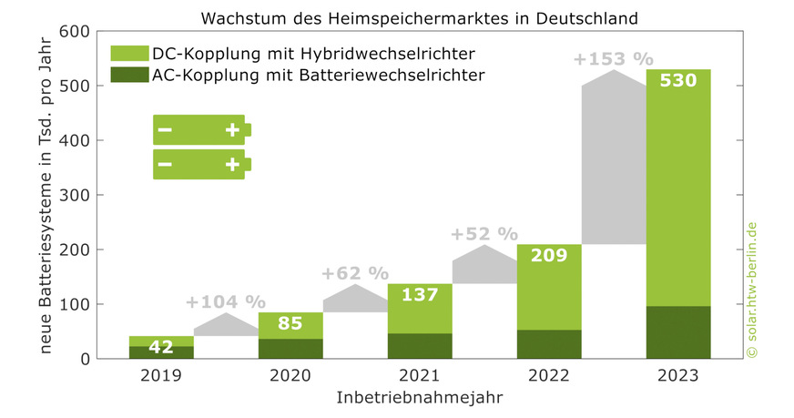 Die Leistung der neu installierten Strompuffer betrug 3,1 Gigawatt. Die Anbindung ans Solarsystem erfolgte dabei vorrangig über einen hybriden Wechselrichter: Mit einem Marktanteil von 82 Prozent dominierten hybride Umrichter den Heimspeichermarkt.