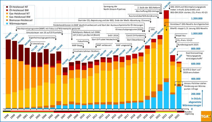 Was den Heizungsmarkt antreibt, bremst und begleitet, zeigt auf dem Zeitstrahl eine Zusammenführung der Absatzzahlen mit für die Branche wichtigen Ereignissen.