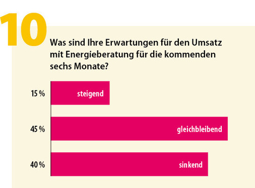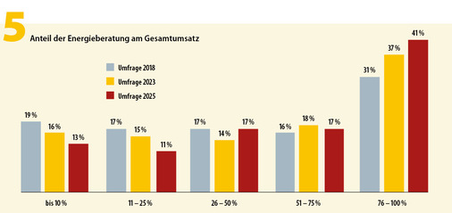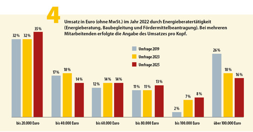 Sucht man der Ursache, warum es an Nachwuchs in der Energieberatung fehlt, finden sich gleich mehrere Erklärungen. Eine liegt in den sinkenden Verdienstmöglichkeiten: Gaben bei der Umfrage von 2019 noch 26 % an, dass dieser über 100.000 Euro liegt, schrumpfte dieser Anteil nun auf 16 %; bei der Angabe bis 20.000 Euro stiegt hingegen der Anteil von 32 auf 35 %. Bedeutet: Der Umsatz insgesamt sinkt, wohingegen aber der Anteil der Energieberatung am Gesamtumsatz im oberen Bereich (76 bis 100 %) binnen sieben Jahren von 31 auf 41 % gestiegen ist.