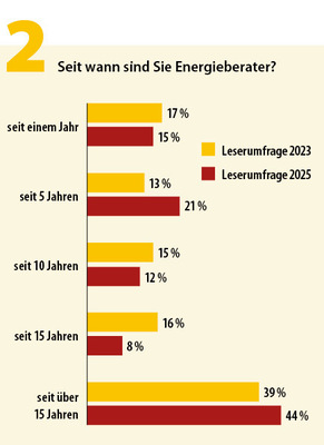 Angefangen bei den Fragen zu beruflicher Qualifikation, Erfahrung und Alter zeigt sich ein stabiler Trend: Die Ausbildung im „Erstberuf“ basiert zu knapp drei Viertel auf akademischen Säulen – die meisten Energieberater sind studierte Ingenieure (55 %), Architekten (16 %) und Quereinsteiger/Sonstige wie zum Beispiel Physiker. Ein Viertel kann mit einem baupraktisch orientierten Hintergrund aufwarten – darunter Handwerker (13 %), Techniker (13 %) und Schornsteinfeger, die mit vier Prozent die kleinste Gruppe im Reigen sind. Mehr als die Hälfte kann 15 und mehr Jahre Erfahrung in der Energieberatung vorweisen.