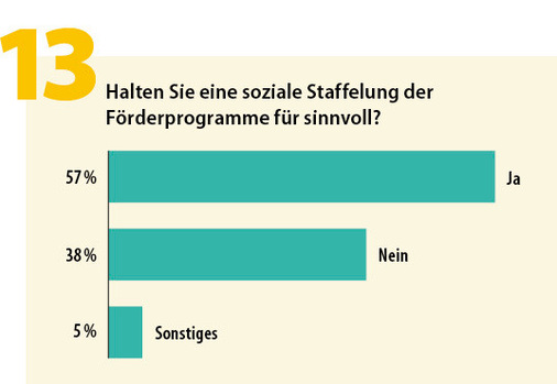 Nicht ganz eindeutig ist die Haltung der Energieberatenden bei der Frage, ob eine soziale Staffelung der Förderprogramme sinnvoll ist – dass 38 % dieser Überlegung kritisch gegenüberstehen, mag nach Einschätzung von Zukunft Altbau auch daran liegen, dass Energieberater in dem Zusammenhang „erhebliche Umsetzungsschwierigkeiten und Bürokratierisiken“ befürchten.