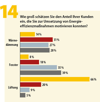 Ein interessantes Ergebnis liefert die Frage nach den empfohlenen und von Kunden umgesetzten Energieeffizienzmaßnahmen: Die Lüftung landete weit abgeschlagen hinter Wärmedämmung und Fenster. Daraus lässt sich ableiten, dass eingesparte Energiekosten mehr zählen als Komfort und Raumluftqualität, wenngleich die Lüftungsverluste über Fenster und ohne Wärmerückgewinnung bei den Betriebskosten einen messbaren Anteil haben.