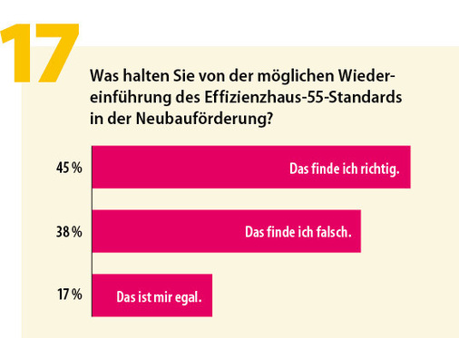 Nicht so ganz einhellig ist die Branche bei der Frage, ob der Effizienzhaus-55-Standard in der Neubauförderung wieder eingeführt werden soll: 45 % sind dafür, 38 % halten diesen Weg für falsch. Damit überwiegt die Zustimmung, und auch der GIH begrüßt die Wiedereinführung: „Sie setzt im Neubaubereich wichtige Anreize, um mehr energieeffizienten Wohnraum zu schaffen. Entscheidend ist dabei, dass der EH55-Standard nicht isoliert betrachtet wird, sondern Teil einer Gesamtstrategie bleibt, bei der die Sanierung des Gebäudebestands weiterhin im Vordergrund steht.“