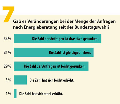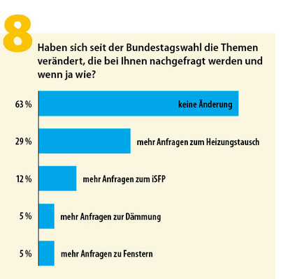 Tatsächlich gaben 34 % der Befragten an, dass die Zahl an Anfragen seit der letzten Bundestagswahl drastisch gesunken ist; nur fünf Prozent verzeichneten einen leichten Anstieg. Dass es an Impulsen fehlt, eine Energieberatung anzugehen, zeigt auch das Verharren bei den nachgefragten Themen (63 %). Vermehrt nachgefragt haben die Kunden lediglich Heizungstausch (29 %) und iSFP (12 %). Die Klassiker Gebäudedämmung und Fenstertausch finden aktuell mit einer lediglich fünfprozentigen Zunahme nur wenige Kunden attraktiv.