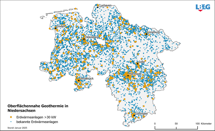 Erstmals hatte die Behörde zudem Zahlen für die oberflächennahe Geothermie erhoben. Demnach gab es zum Jahreswechsel rund 26.600 oberflächennahe Geothermieanlagen in ganz Niedersachsen. Innerhalb von sieben Jahren habe sich die Zahl verdoppelt, so das LBEG. Circa 91 Prozent werden mit Erdsonden, acht Prozent mit Kollektoren und knapp ein Prozent mit Brunnen betrieben.