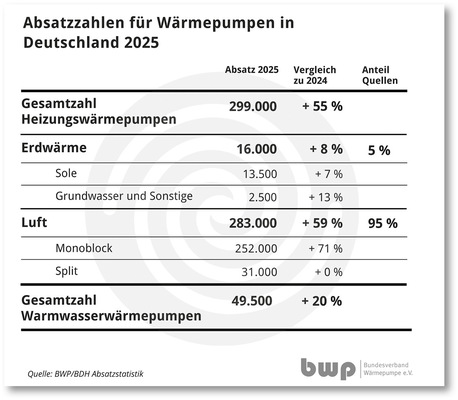 Im Bundesverband Wärmepumpe (BWP) sind über 1.300 Unternehmen der Heizungsindustrie, Handwerksbetriebe, Planungs- und Architekturbüros, Bohrfirmen sowie Energieversorger organisiert. Die Branche beschäftigt rund 70.000 Mitarbeiterinnen und Mitarbeiter. Im Jahr erwirtschaftet sie etwa 3,5 Milliarden Euro. 95 Prozent der verkauften Wärmepumpen werden von Mitgliedsunternehmen des BWP produziert und vertrieben.