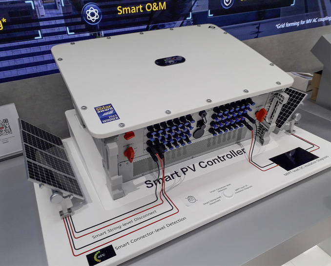 Huawei Technologies: Der Sun2000-330KTL ist ein trafoloser, kompakter Stringwechselrichter für Solarparks, der 330 Kilovoltampere erreicht. Aufgrund des weiten Eingangsstrombereichs ist er für Module mit den Zellgrößen 162, 180 und 210 Millimeter geeignet. Die Eingangsspannung von 1.500 Volt ermöglicht lange Modulstränge und ein effizientes Anlagenlayout. Außerdem beinhaltet der Wechselrichter ein Diagnosetool, das Fehler in der Solaranlage identifiziert. Zudem bietet er schnellen und zuverlässigen Schutz auf der Gleichstromseite.