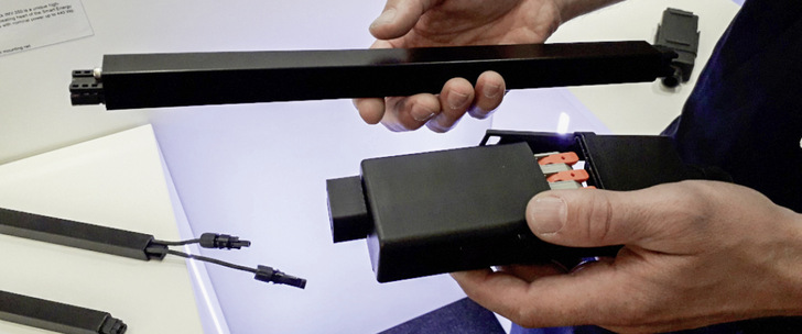 Das junge Unternehmen Solarnative aus Frankfurt am Main stellt den Power Stick INV-350 vor. Die Innovation gehörte zu den Finalisten des Intersolar Awards 2022. Dank ausgefeilter Hochfrequenztechnik und konsequentem Abspecken wird der Mikrowechselrichter in den Rahmen handelsüblicher Photovoltaikmodule integriert. Der Metallrahmen dient dabei auch als Kühlfläche.